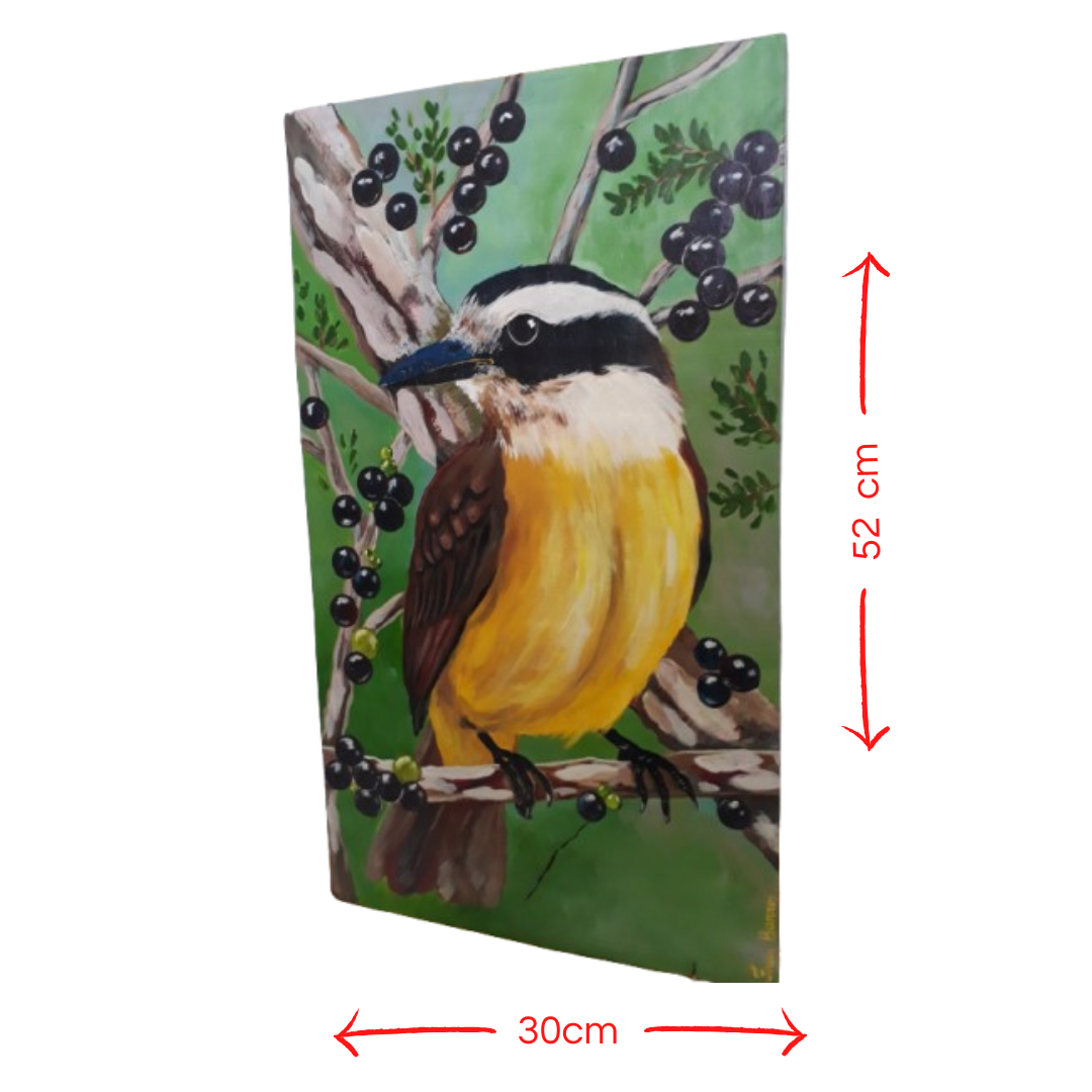 Um bem-te-vi repousa delicadamente entre as folhas e frutas da jabuticabeira, transformando seu ambiente em um refúgio de paz, liberdade e beleza.