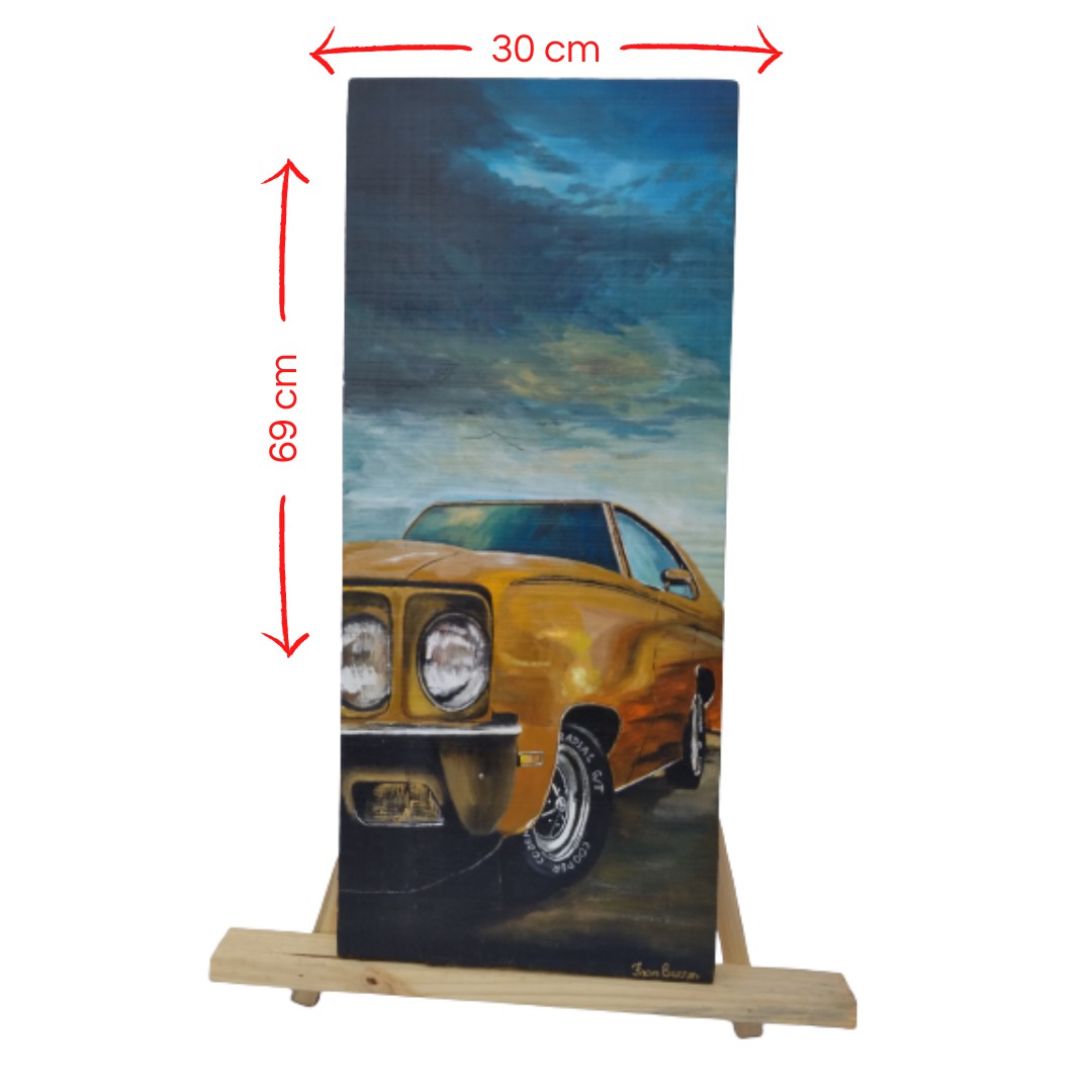 Quadro rústico de madeira de pinus, tamanho 69cm x 30cm x 2cm, pesando 2,300 kg.
